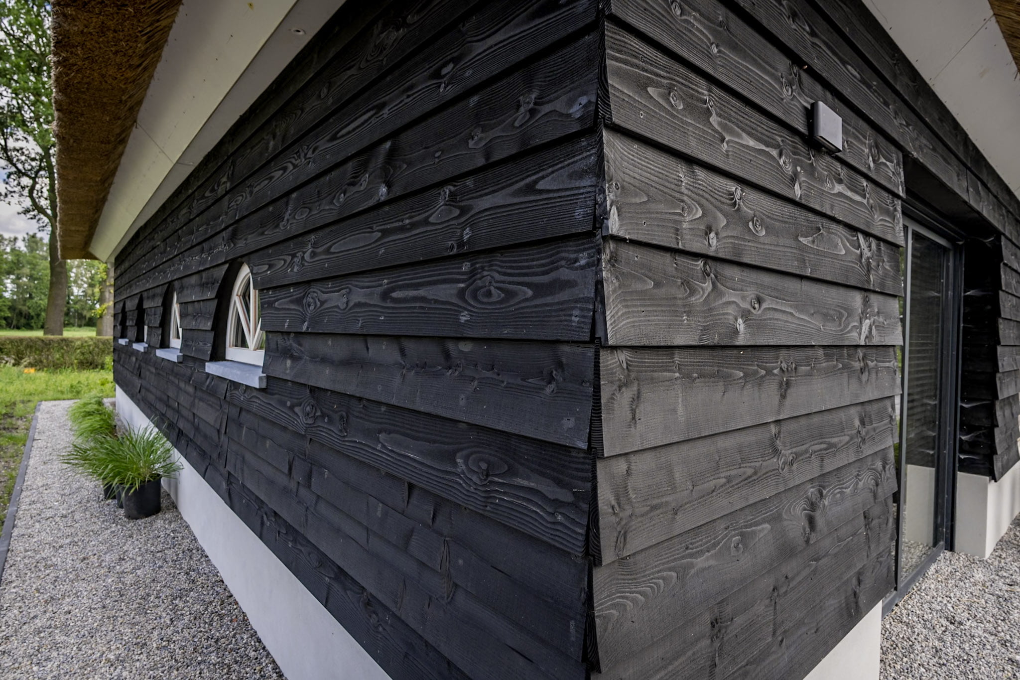 Bij de renovatie is veel van de oorspronkelijke structuur behouden gebleven. De eikenhouten balkenconstructie is zorgvuldig gerestaureerd en vormt nu een prominent onderdeel van het interieur. Deze constructie draagt sterk bij aan de warme, landelijke sfeer van de woning. De buitenkant van de villa is afgewerkt met Zweeds Rabat Red Cedar in de kleur zwart, een populaire keuze in luxe woningbouw vanwege het duurzame en stijlvolle karakter. Deze gevelbekleding is niet alleen visueel aantrekkelijk, maar biedt ook uitstekende bescherming tegen weersinvloeden, wat essentieel is voor woningen in een landelijke omgeving zoals Someren en Asten.